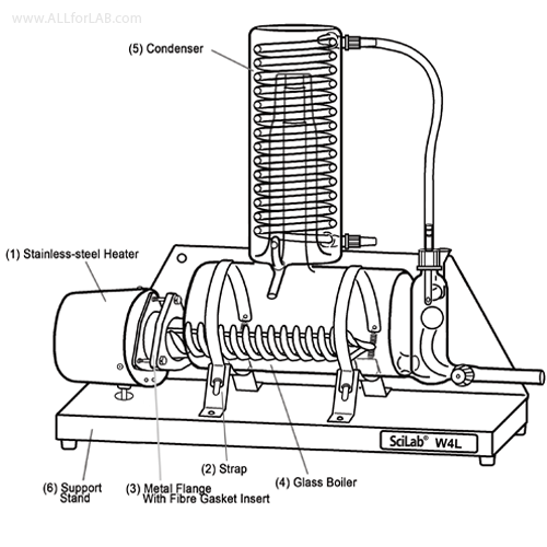 Heat Resistant Borosilicate Glass Boiler fitted with 3kW 304 Stainless-steel Heater Connect and Operate Directly from Tap Water - Distillation output: 4 Liters/hour - Distillation quality: + pH: 5.0 to 6.5 pH + Thermal conductivity: 3.0 to 4.0 µs/cm + Resistivity: 0.25 to 0.30 ㏁.cm + Temperature: 25℃ to 35℃ + Pyrogen Free - Water supply requirement: 1 liter/minute, minimum 3psi (0.2 bar) - Dimensions (W x D x H): 500 × 150 × h450 mm - Power Supply: 220/240V, 50/60Hz |